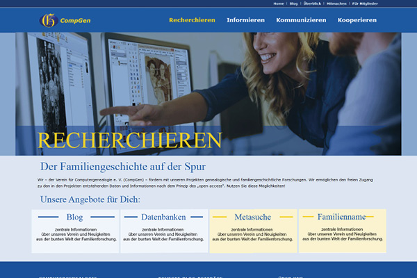 CompGen ist Deutschlands größte, nicht kommerzielle genealogische Vereinigung. Im Laufe der Zeit hat der Verein auf unterschiedlichen Plattformen ein breites Repertoire an kostenlosen Dienstleistungen für Familienforscher aufgebaut. Eine neue Homepage sollte das Angebot konsolidieren und in einer strukturierten und ansprechenden Form den Ahnenforschern präsentieren.